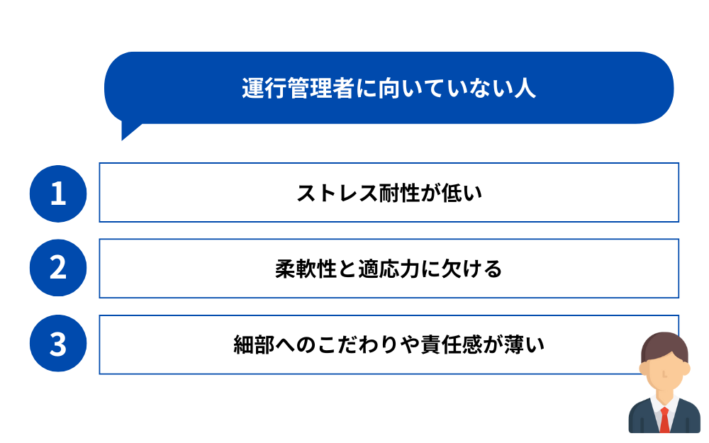 運行管理者は、常に大きな責任とプレッシャーを感じる仕事です。それだけに、ストレス耐性の低い人は、この職務に向いていないと言えるでしょう。