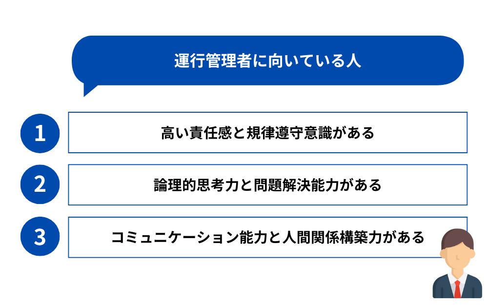 運行管理者に最も求められるのは、「安全第一」の意識と、強い責任感です。交通事故を未然に防ぎ、ドライバーと公衆の安全を守るという使命感を持つことが何より重要です。