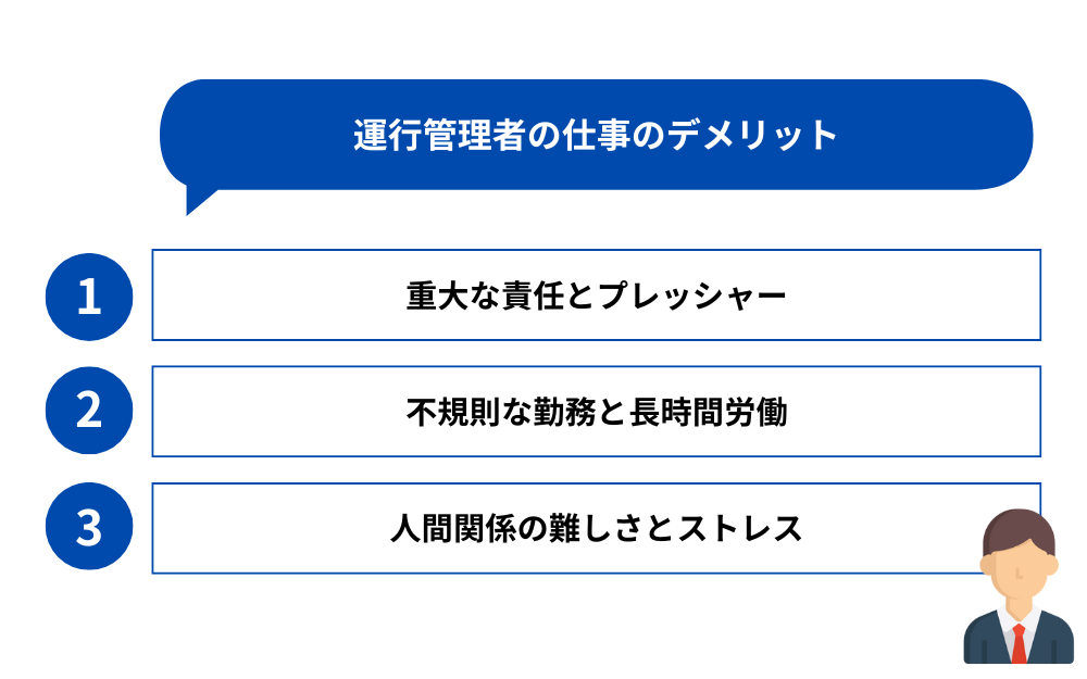 運行管理者の仕事には、重い責任とプレッシャー、不規則な働き方など、様々なデメリットが存在します。仕事のやりがいの裏返しとも言えるこれらの負の側面について、具体的に見ていきましょう。