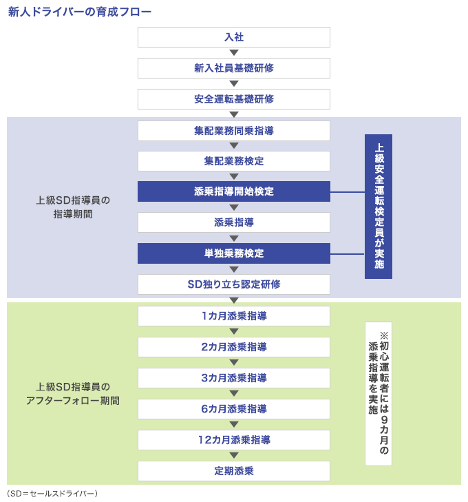 また、上級SD指導員というプロが新人ドライバーの育成にマンツーマンで指導し、上級安全運転検定員が新入社員のひとり立ちを認定するという流れで、スキルアップできる環境が整っています。