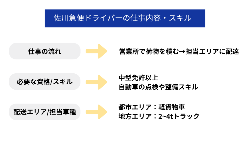 佐川急便のドライバーは、荷物の集荷、配達、荷物管理などを担当します。決められた時間内に確実に荷物を届けることが求められるため、安全運転と効率的な配送ルート組みが重要なスキルとなります。