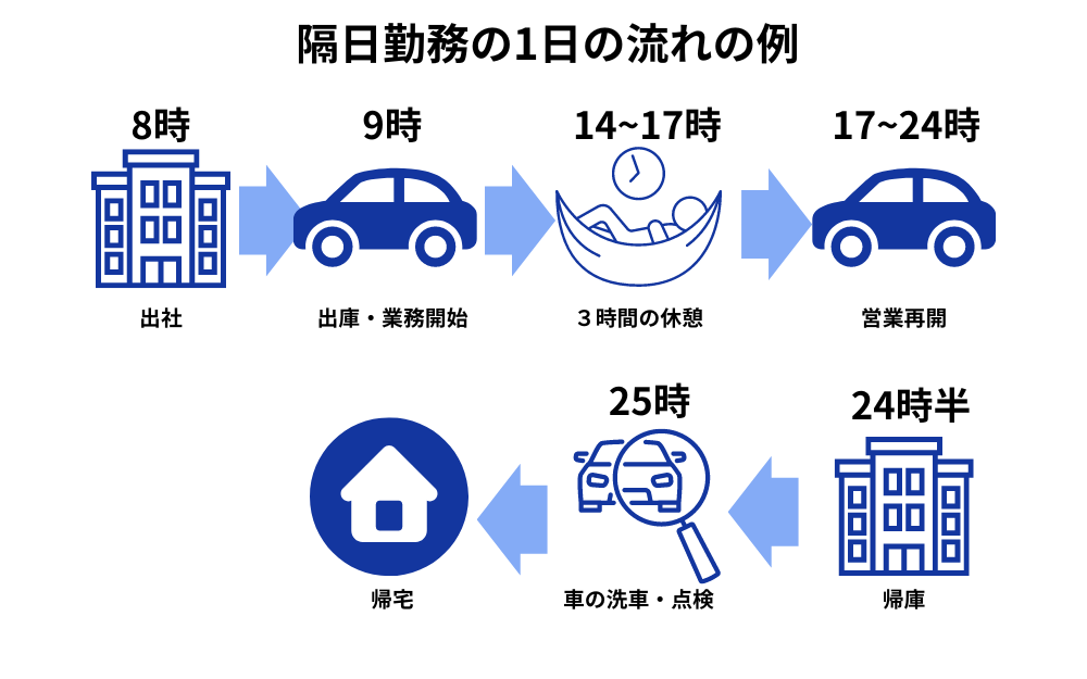 - 隔日勤務ドライバーの始業から終業までの1日の流れ