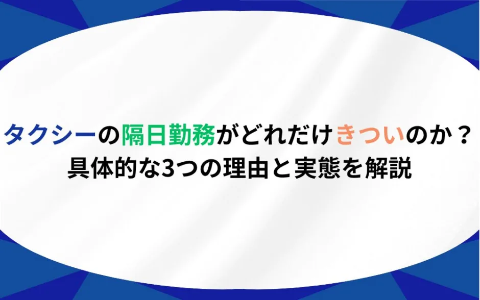 タクシードライバーの勤務形態で最も一般的な「隔日勤務」。1日おきの休みがある一方で、激務と評されるその実態とは?本記事では、隔日勤務の基本情報から、きついと言われる理由、ドライバーの1日の流れ、過酷さを示すデータ、そして負担を和らげる工夫まで、隔日勤務の全貌に迫ります。