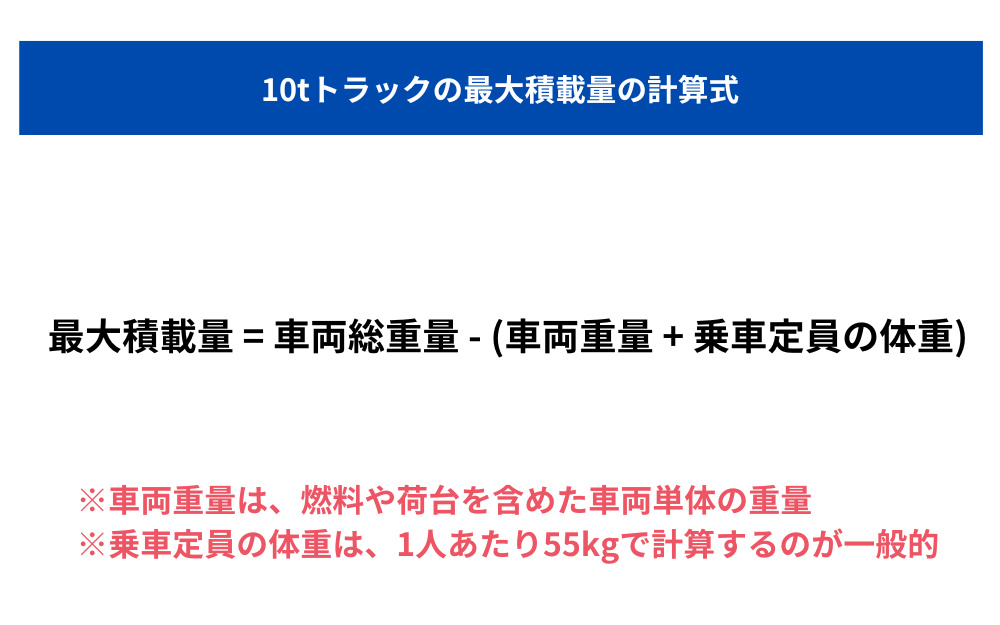 10tトラックの最大積載量は、以下の式で計算することができます。