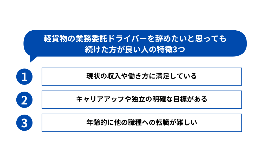 軽貨物の業務委託ドライバーという仕事に、様々な悩みや不満を抱えている人は少なくありません。しかし、辞めたいと思っていても、状況によっては今の仕事を続けた方が賢明な場合もあります。ここでは、業務委託ドライバーを続けた方が良い人の特徴を3つ挙げてみましょう。