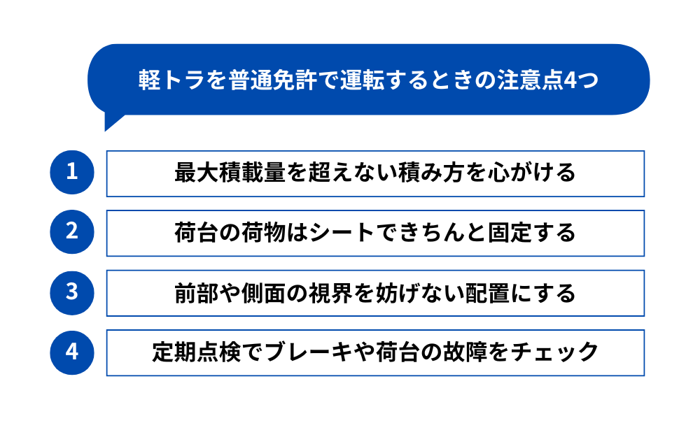 - 軽トラック運転時の最大積載量や荷物の固定方法などの注意点