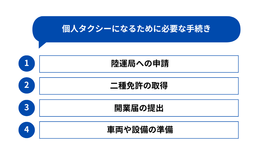 ここでは、個人タクシー事業を始めるために必要な手続きを4つのステップに分けて解説しましょう。