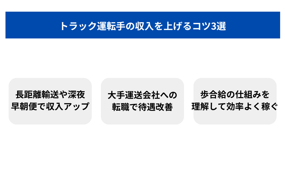 最後にトラック運転手の収入を上げるコツについて、分かりやすく解説します。